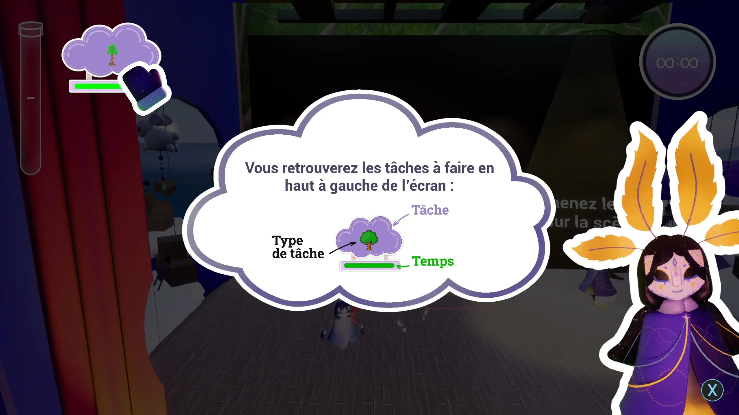 Tasks that require cardboard boxes add markers to the stage showing exactly where to place them.